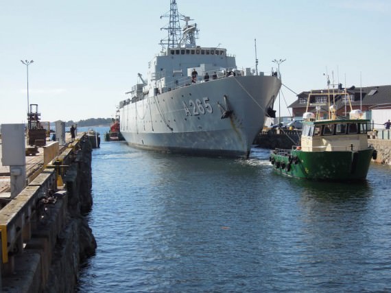HMS Visborg vid kaj i Karlskrona i väntan på bogsering till Landskrona
